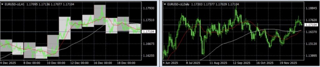 • H1チャートの詳細分析:12月4日00:00〜18日00:00の時間帯で、緑の価格線が赤い移動平均線をサポート。15日00:00の1.17095円から、16日夜間の連続陽線で1.17136円高値を付け、17日03:00の調整(1.17077円)も浅く、18日以降1.17104円で安定。灰色ボリュームの穏やか増加が持続性を示し、変動幅0.0005〜0.0010と低ボラ。RSI55近辺のニュートラルゾーンで、欧州PMI(総合52.8、予想上回り)がユーロ買いを誘発。FOMC後の米ドル売り波及が主導ですが、19日終盤の微調整はクリスマス前の手仕舞いです。