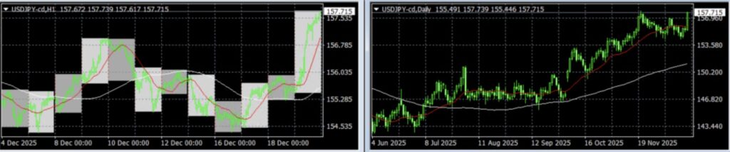 全体として、USD/JPYは「ドル強・円弱」の復活。ロング勢が再台頭ですが、年末流動性低下で急落警戒を。