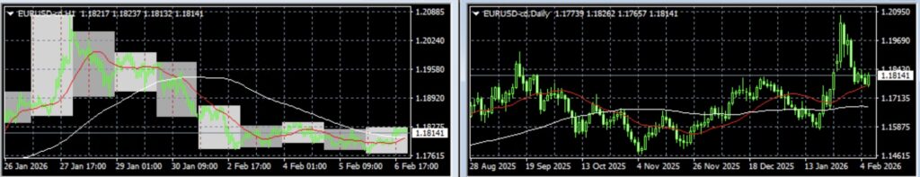 - H1チャートの詳細分析:1月26日17:00〜2月6日17:00の時間帯で、緑の価格線が赤い移動平均線を下回るデッドクロス継続。2日17:00の1.18217円スタートから、4日夜間の連続陰線で1.18237円安値を付け、5日01:00以降の調整(1.18132円)も浅く、6日17:00に1.18141円で着地。灰色ボリュームの売却圧力が強く、変動幅0.0003〜0.0007と低ボラ。RSI45へ低下し、弱含みサイン。ユーロ圏PMIの弱含み(総合51.5)が背景で、@vtchakarovaの投稿でEUのドル依存脱却がユーロの防衛的役割を強調。