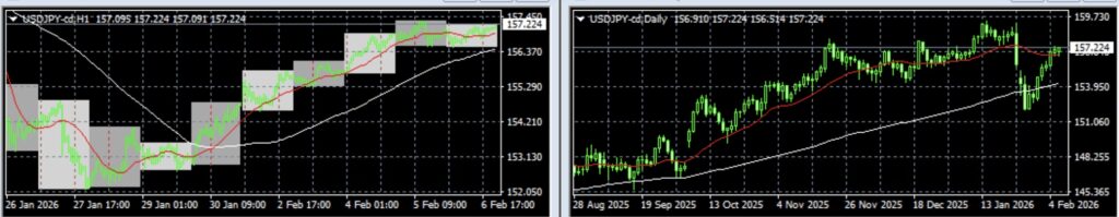 - H1チャートの詳細分析:1月26日17:00から2月6日17:00までの時間軸で、灰色のボリュームバーが売買均衡。2日17:00の157.095円スタートから、4日01:00の小幅押し目(157.091円)を経て、5日以降の陽線で157.224円高値を更新。赤い移動平均線(20期間SMA)が価格線をサポートし、変動幅0.1〜0.3円と低ボラ。6日09:00の157.224円着地は、RSI50近辺のニュートラルゾーンを示唆。米雇用データ後の金利上昇が主因ですが、アジア時間帯の円買い圧力が調整を招きました。FOREX.comの分析では、抵抗157.70-158.08が焦点で、突破で160円視野。