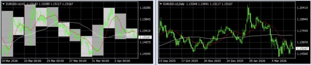 4月3日(金)は欧米休場(聖金曜日)で流動性が低下。米3月雇用統計は概ね予想通りで市場の方向感を決める材料とはならず。ユーロドルは東京市場の限られた取引の中で1.15台前半〜中盤のレンジで推移し、終値は1.15167ドル付近。H1チャートでは短期MA(赤)が下向き気味に転換しており、週後半の軟化を示している。長期MA(白)は1.15台前半付近でフラットに推移し、価格の下支えとして機能している。