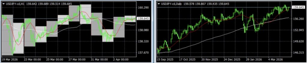 H1チャートの全体像では、3/19安値(157.67円)→3/31高値(160.29円)→4/2安値(158.55円)→4/3終値(159.64円)と、ボラタイルな上下動を繰り返しながらも重心が上昇基調を維持していることが確認できる。短期MA(赤)と長期MA(白)が共に上向きで推移。