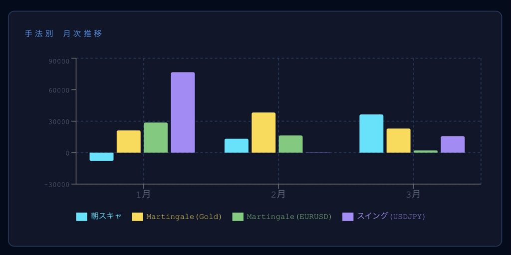 1月は1ポジ系のスイングが利益をもたらし、2月はGOLDとEURUSDのナンピンマーチン系、3月はマーチンの失策を朝スキャがカバーしました。