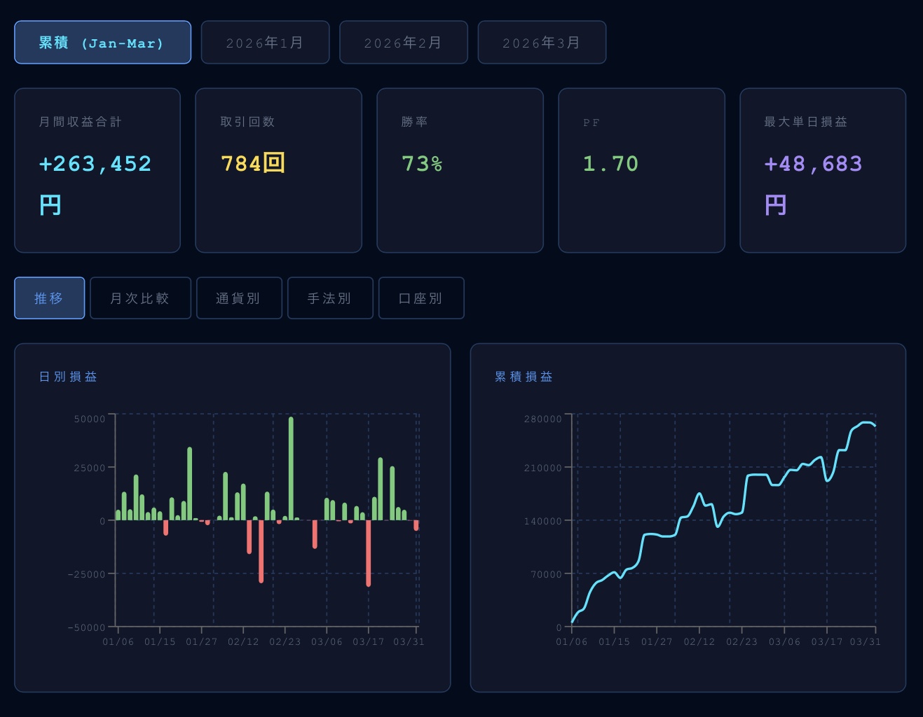 1月は1ポジ系のスイングが利益をもたらし、2月はGOLDとEURUSDのナンピンマーチン系、3月はマーチンの失策を朝スキャがカバーしました。